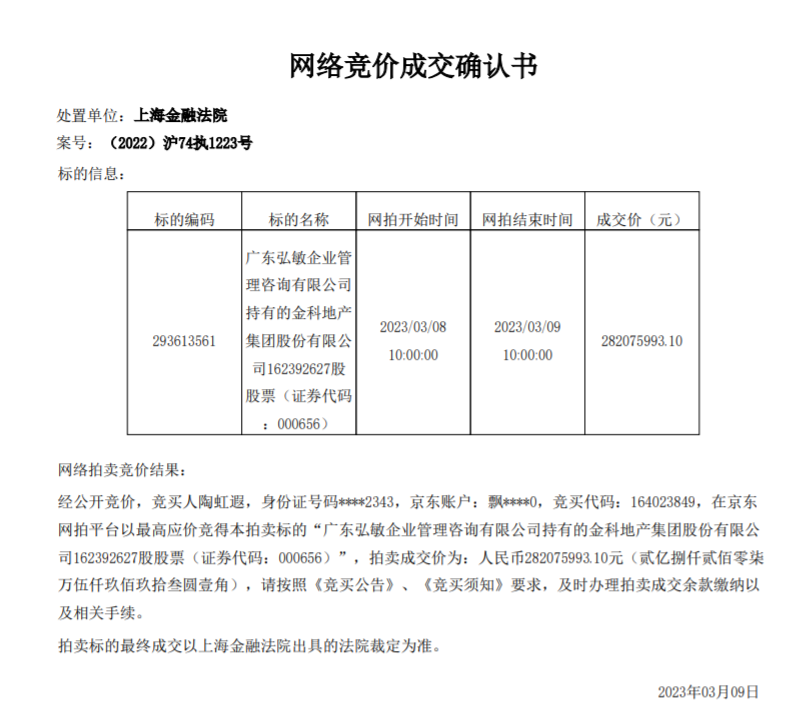 值得一提的是,陶虹遐为金科股份创始人黄红云前妻,拍卖出价时间为3月8日22:56。