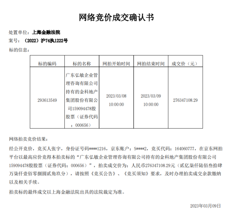 大公房产讯 京东司法拍卖平台显示,3月9日,金科股份股东广东弘敏企业管理咨询有限公司持有的公司股份约4.8058亿股中,1.59亿股、1.62亿股股票交易成功,另一笔最终因无人出价而流拍。