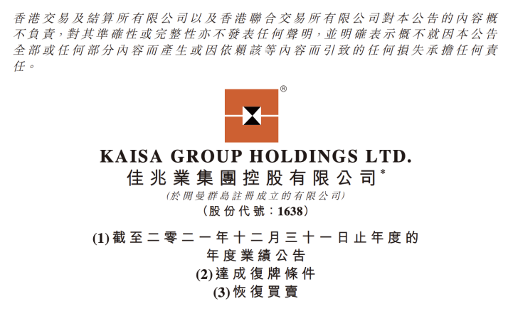 3月9日晚间,佳兆业集团控股有限公司(1638.HK,以下简称“佳兆业集团”)发布2021年度业绩报告及2022上半年业绩报告。至此,佳兆业集团已达成全部复牌条件并将于3月10日9时起正式在香港联交所恢复买卖,标志着佳兆业风险化解工作取得重大突破。