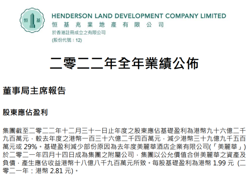 大公房产讯 3月21日,恒基兆业地产有限公司(股份代码00012.HK,下称恒基地产)发布2022年全年业绩公告。期内,集团股东应占基础盈利为96.29亿港元,同比下降29%。每股基础盈利为1.99港元。