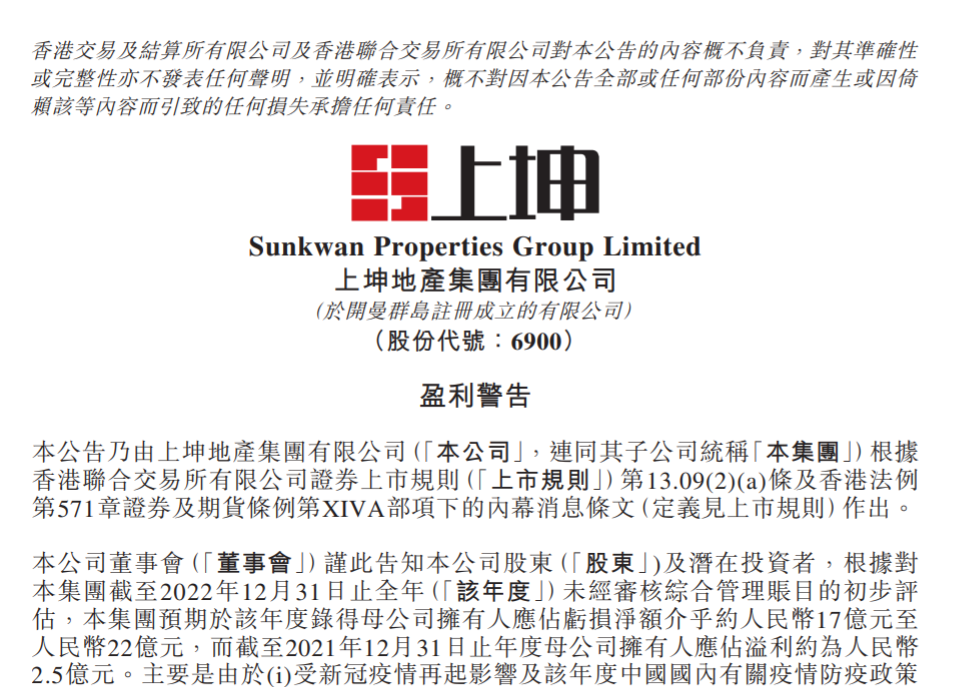 同时,上坤地产在公告中披露,预计将不晚于2023年3月31日刊发的公司截至2022年12月31日止年度业绩公告。
