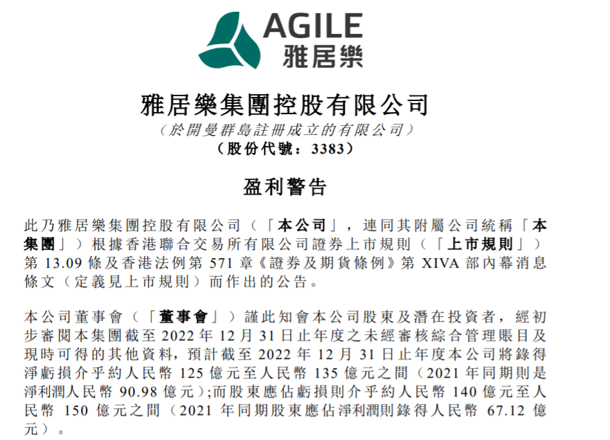 雅居乐表示,经初步审阅集团截至2022年12月31日止年度未经审核综合管理账目及现时可得的其他资料,预计截至2022年12月31日止年度公司将录得净亏损介乎约125亿元至135亿元之间(2021年同期则是净利润90.98亿元);而股东应占亏损则介乎约140亿元至150亿元之间(2021年同期股东应占净利润则录得67.12亿元)。