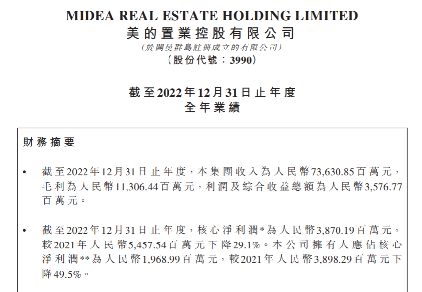 大公房产讯 近日,美的置业控股有限公司(股份代号3990.HK)发布了截至2022年12月31日止年度全年业绩。