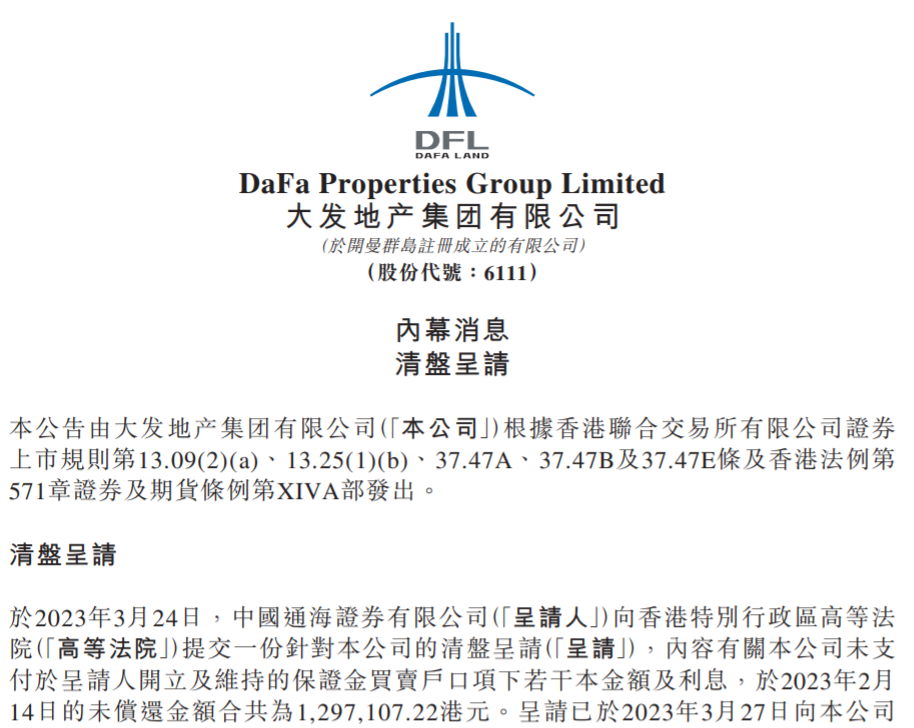大公房产讯 3月28日,大发地产发布公告称,于2023年3月24日,中国通海证券有限公司向香港特别行政区高等法院提交了一份针对公司的清盘呈请,内容有关公司未支付于呈请人开立及维持的保证金买卖户口项下若干本金额及利息,于2023年2月14日的未偿还金额合共为129.71万港元。呈请已于3月27日向公司送达。