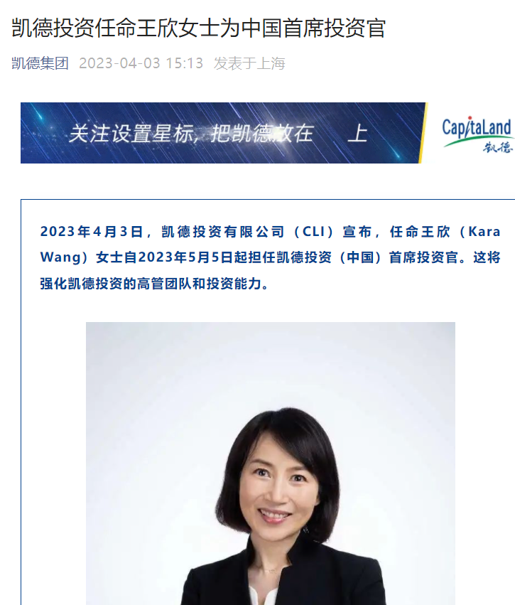 大公房产讯 4月3日,据凯德集团官方公众号消息,凯德投资有限公司(CLI)宣布,任命王欣(KaraWang)自2023年5月5日起担任凯德投资(中国)首席投资官。