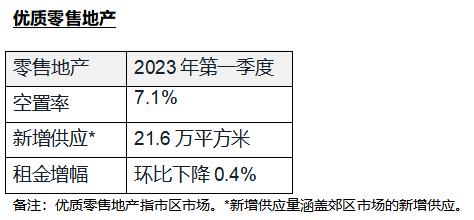 租金谈判微幅让步以吸引更优质品牌入驻。尽管租赁需求有所回升,但品牌方利润出现增长且推升承租力的趋势并未在第一季度即刻得到体现。此外,仍有面临空置压力的业主对高品质品牌做出微幅租金让步,以此填补空置面积的同时提高项目定位。市区市场租金录得小幅下跌,环比下降0.4%(同比下跌5.1%),郊区市场租金环比下降0.6%(同比下跌6.4%)。