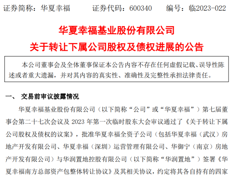 目前,华夏幸福下属公司已与华润置地签署《华夏幸福南方总部资产包整体转让协议》及其相关协议,并已完成标的股权持有人变更的工商登记手续等交割事宜。经双方确认,本次交易先决条件均已成就。