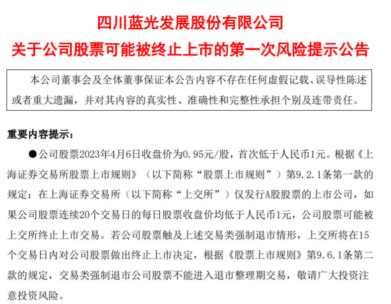 公告显示,蓝光发展股票2023年4月6日收盘价为0.95元/股,首次低于人民币1元。根据《上海证券交易所股票上市规则》第9.2.1条第一款的规定,在上交所仅发行A股股票的上市公司,如果公司股票连续20个交易日的每日股票收盘价均低于人民币1元,公司股票可能被上交所终止上市交易。若公司股票触及上述交易类强制退市情形,上交所将在15个交易日内对公司股票做出终止上市决定,根据《股票上市规则》第9.6.1条第二款的规定,交易类强制退市公司股票不能进入退市整理期交易。