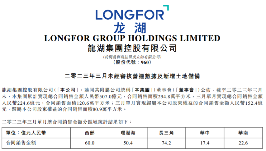 于2023年3月单月,龙湖集团实现总合同销售金额224.6亿元,合同销售面积120.6万平方米;实现归属公司股东权益的合同销售金额152.4亿元,归属公司股东权益的合同销售面积80.9万平方米。