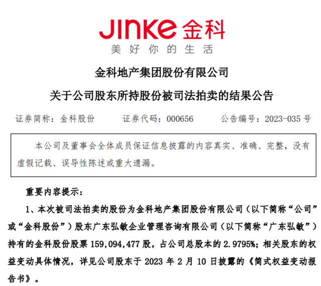 大公房产讯 4月11日,金科地产集团股份有限公司发布关于公司股东所持股份被司法拍卖的结果公告。