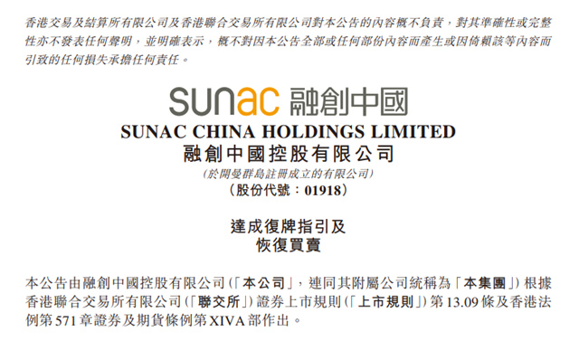 根据复牌公告,融创分别在2022年12月、今年3月底完成发布2021年年度业绩、2022年中期及全年业绩。上述业绩刊发后,根据上市规则,融创没有须刊发而未刊发的财务业绩,满足复牌指引。