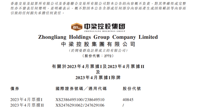 大公房产讯 4月14日,中梁控股发布有关2023年4月票据I及2023年4月票据II及2023年4月票据I除牌公告。