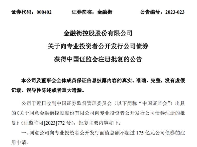 大公房产讯 4月17日,金融街控股股份有限公司发布公告称,公司于近日已收到中国证监会出具的关于向专业投资者公开发行公司债券的批复(以下简称《批复》)。