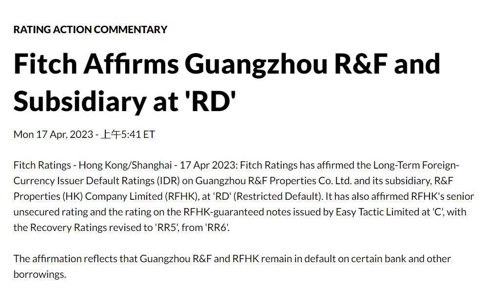 大公房产讯 4月17日,惠誉国际评级发布报告称,已确认广州富力地产有限公司及其子公司富力地产(香港)有限公司(以下简称“香港富力”)长期外币发行人违约评级(IDR)为“RD”(限制违约)。