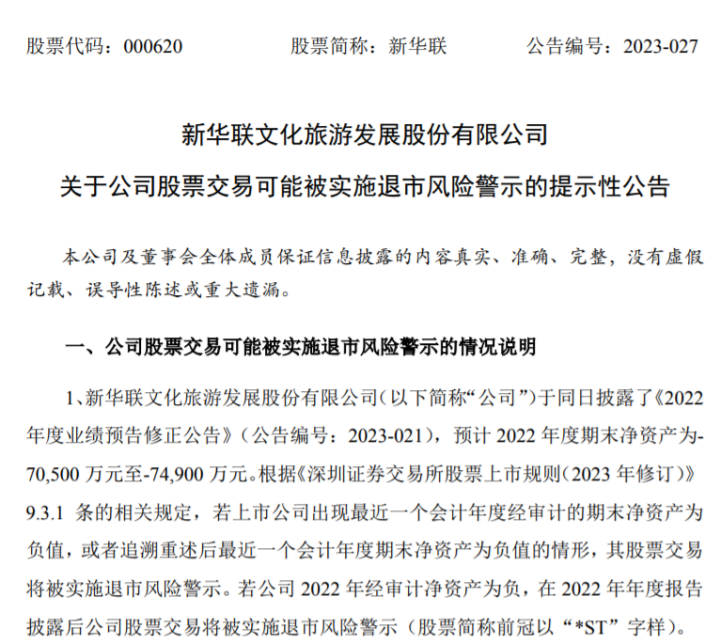 据了解,新华联于4月18日发布公告称,公司预计2022年度期末净资产为-7.05亿元至-7.49亿元,根据《深圳证券交易所股票上市规则(2023年修订)》9.3.1条的相关规定,若上市公司出现最近一个会计年度经审计的期末净资产为负值,或者追溯重述后最近一个会计年度期末净资产为负值的情形,其股票交易将被实施退市风险警示。若新华联2022年经审计净资产为负,在2022年年度报告披露后其股票交易将被实施退市风险警示。