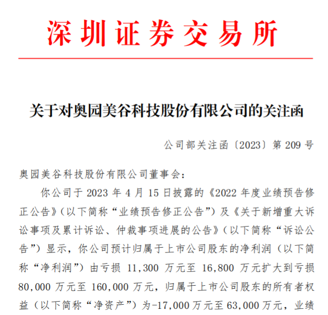 深交所表示,奥园美谷因预计2022年净资产为负,公司股票可能触及《股票上市规则》第9.3.1条规定的退市风险警示情形。