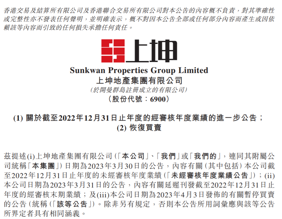 于2023年4月19日,上坤地产披露了截至2022年12月31日止年度的经审核年度业绩。