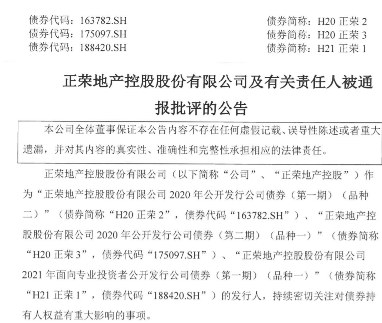 正荣地产表示,公司及有关责任人被通报批评对公司生产经营、财务状况及偿债能力暂无重大不利影响。公司及相关责任人高度重视,严格遵守《上市规则》等法律、法规规定,依法履行信息披露义务,切实维护债券持有人合法权益。