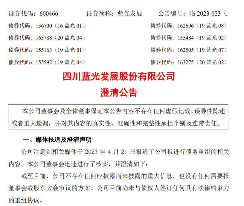 公告显示,蓝光发展注意到相关媒体于2023年4月21日报道了公司拟进行债务重组的相关内容。该公司董事会迅速进行了核实,并澄清如下:截至目前,公司不存在任何应披露而未披露的重大信息,也没有任何需要报董事会或股东大会审议的方案。公司目前尚未与债权人签订任何具有法律约束力的重组协议。