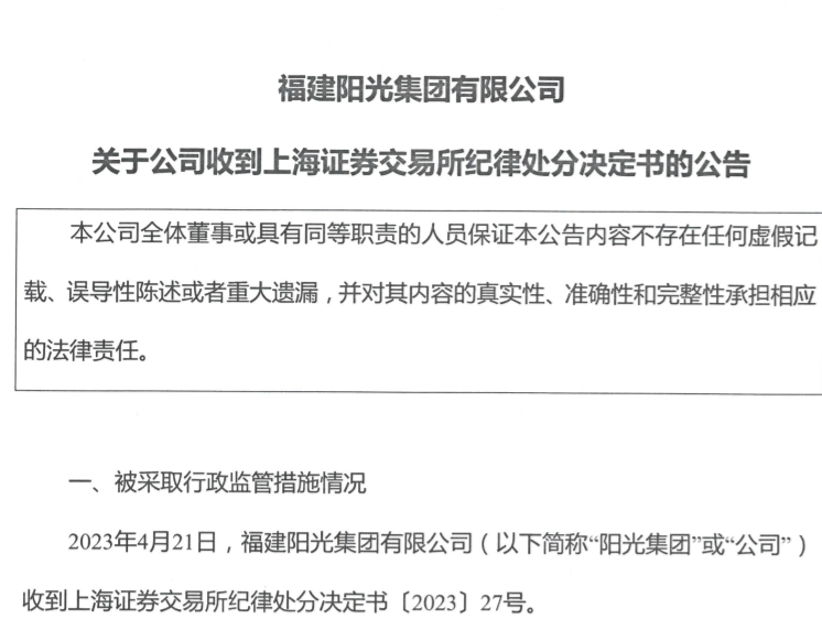 大公房产讯 4月24日,福建阳光集团有限公司(以下简称“阳光集团”)发布关于公司收到上海证券交易所纪律处分决定书的公告。