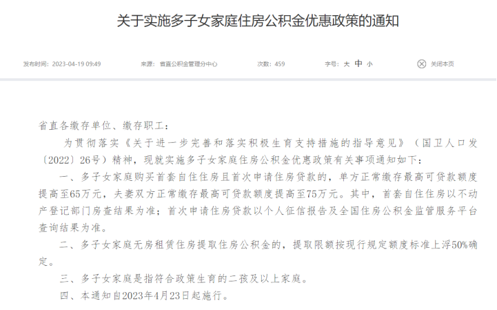 《通知》提到,符合政策生育的二孩及以上的多子女家庭购买首套自住住房且首次申请住房贷款的,单方正常缴存最高可贷款额度提高至65万元,夫妻双方正常缴存最高可贷款额度提高至75万元。多子女家庭无房租赁住房提取住房公积金的,提取限额按现行规定额度标准上浮50%确定。
