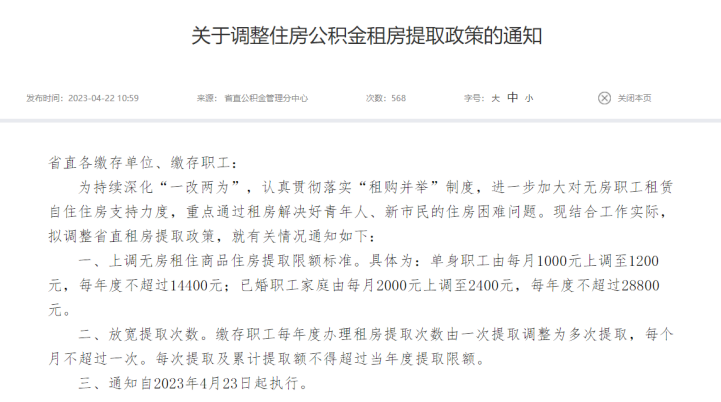 同时,放宽提取次数,缴存职工每年度办理租房提取次数由一次提取调整为多次提取,每个月不超过一次,每次提取及累计提取额不得超过当年度提取限额。以上通知自2023年4月23日起执行。