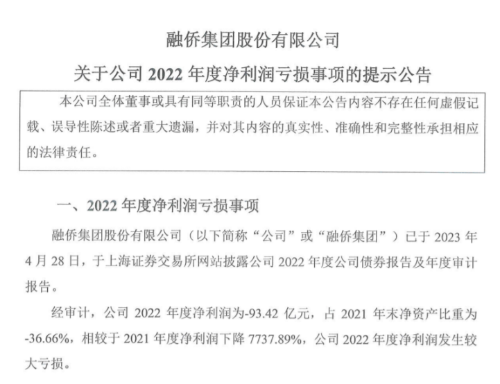 经审计,融侨集团2022年度净利润为-93.42亿元,占2021年末净资产比重为-36.66%,相较于2021年度净利润下降7737.89%,公司2022年度净利润发生较大亏损。