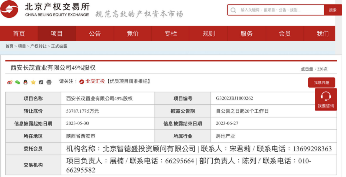 大公房产讯 5月30日,北京产权交易所信息显示,中国金茂旗下子公司西安长茂置业有限公司49%股权挂牌转让,转让底价为53787.1775万元,转让方为西安顺茂置业有限公司,信息披露起止日期为2023年5月30日至6月27日。