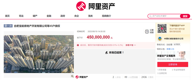 大公房产 6月20日,阿里资产交易平台显示,合肥宝能房地产开发有限公司等45户债权资产正式拍卖,成交价为拍卖底价4.5亿元,竞买号为T2410。