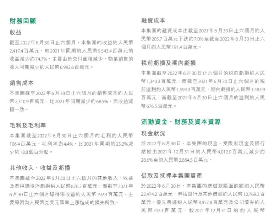 于2022年6月30日,当代置业现金、受限制现金及银行结余约人民币28.65亿元,同比减少约28.6%;融资成本1.91亿元,同比减少约7.0%。
