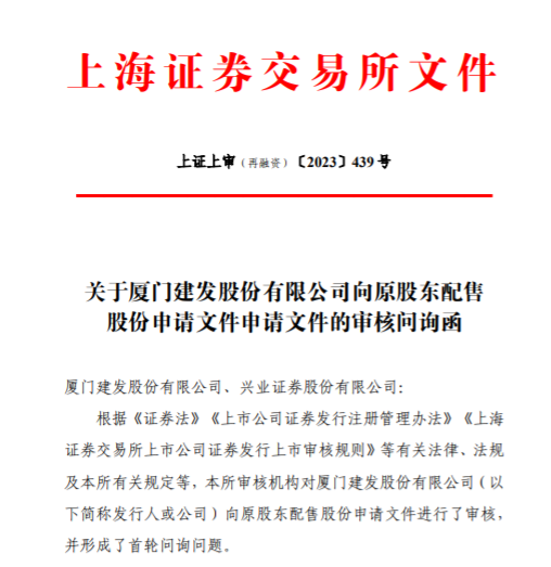 大公房产讯 6月30日,厦门建发股份有限公司(股票代码:600153,股票简称:建发股份)发布公告称,公司于6月29日收到上交所出具的《关于厦门建发股份有限公司向原股东配售股份申请文件的审核问询函》(以下简称“问询函”)。