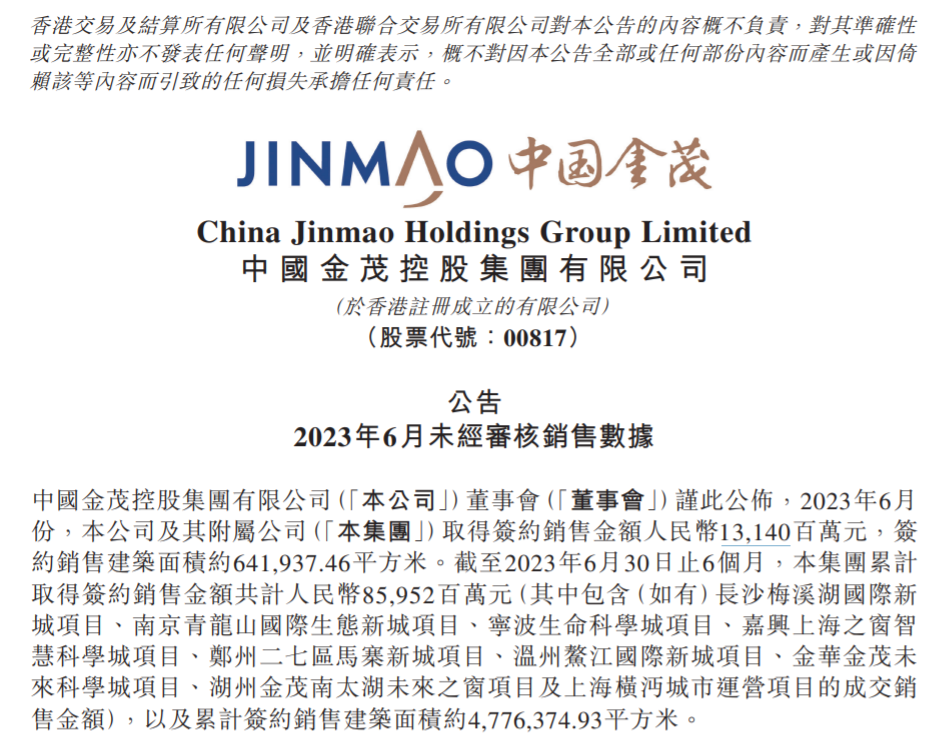 截至2023年6月30日止6个月,中国金茂及其附属公司取得累计签约销售金额人民币859.52亿元,同比增长约23%,签约销售建筑面积约477.64万平方米。