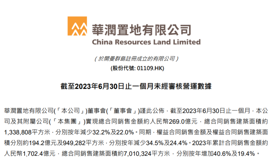大公房产讯 7月10日,华润置地公布截至2023年6月30日止一个月未经审核营运数据。