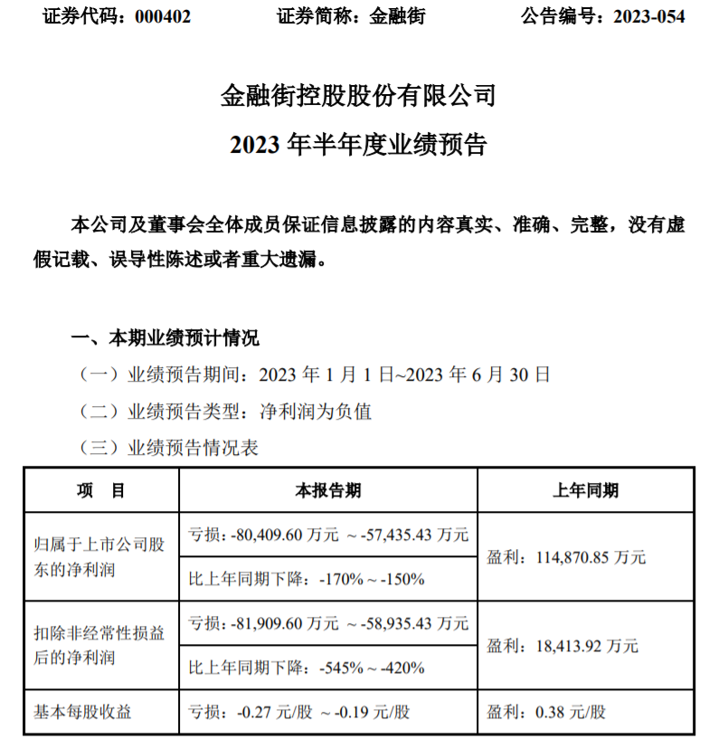 大公房产讯 7月14日,金融街控股股份有限公司发布2023年半年度业绩预告。