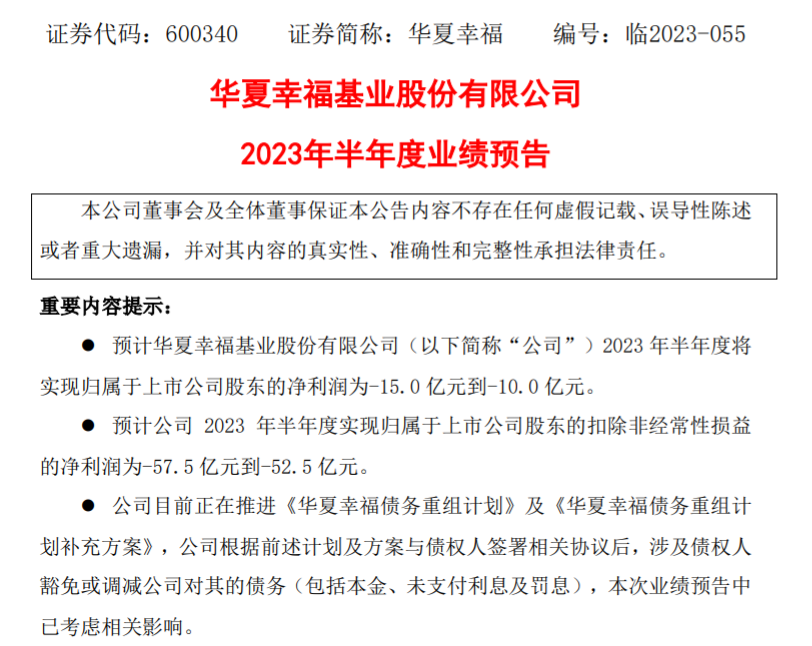 此外,华夏幸福还表示,2023年上半年受公司流动性风险冲击及行业环境等持续影响,公司产业新城及相关业务收入确认受到一定程度影响。公司部分房地产项目工程进度出现延迟,项目竣备、交房进度亦受到一定程度影响,导致2023年上半年房地产业务收入确认金额下降。为化解公司债务风险,加快促进公司有序经营,根据公司《债务重组计划》总体安排,上半年公司将部分变现能力强的资产予以出售,相关交易亏损对当期业绩造成了较大影响。
