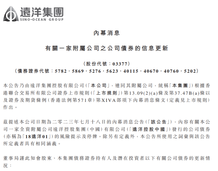 大公房产讯 7月25日,远洋集团发布关于一家附属公司债券信息更新的公告。
