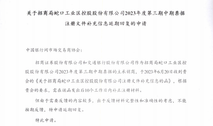 据了解,招商蛇口于2023年6月20日收到交易商协会《关于招商局蛇口工业区控股股份有限公司注册文件补充信息的函》,根据要求,公司需在该函发出后10个工作日内补正注册材料。
