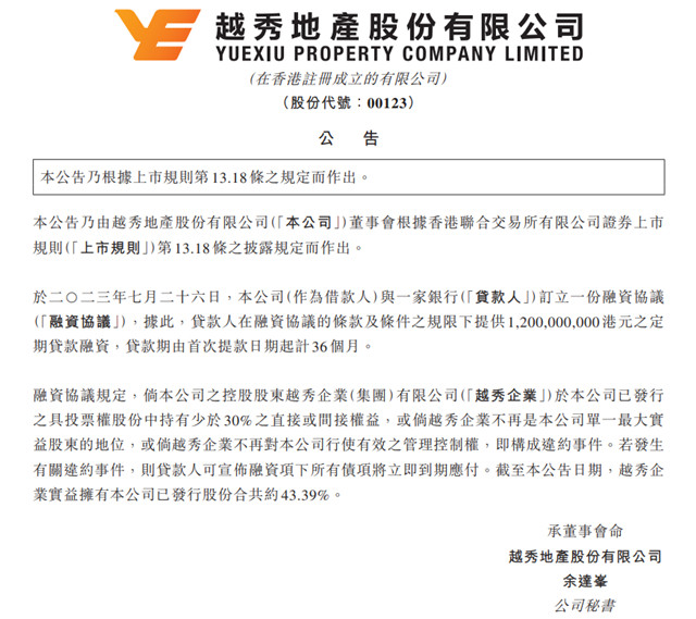 据了解,融资协议规定,若越秀地产的控股股东越秀企业(集团)有限公司于公司已发行的具投票权股份中,持有少于30%直接或间接权益;或者越秀企业不再是公司单一最大实益股东的地位;又或者如果越秀企业不再对公司行使有效之管理控制权,即构成违约事件。