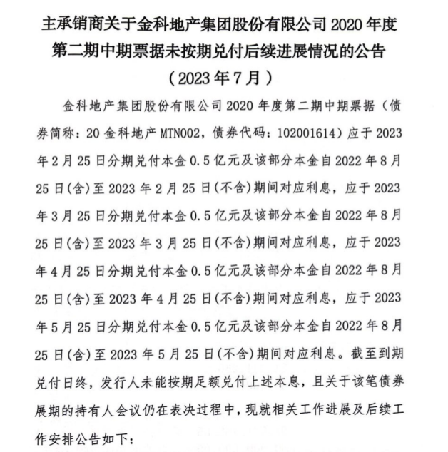 中国民生银行方面表示,因发行人资金链紧张,我行于2023年1月28日作为召集人组织召开了金科地产集团股份有限公司2020年度第二期中期票据2023年第一次持有人会议,本次持有人会议表决过程中,发行人未能按期足额兑付到期应付本金和利息。发行人未按期足额偿付本息以来,我行一直与发行人就后续处置工作保持密切沟通,并将在持有人会议表决结束后及时披露相关事项。