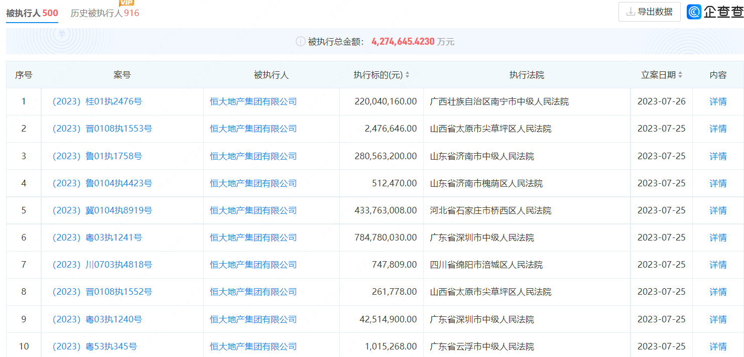 截至7月27日,恒大地产共有500条被执行人记录,被执行总金额427.46亿元。同时,该公司还存在411条限制高消费记录,涉案总金额约131.19亿元,另外还有77条失信被执行人记录。