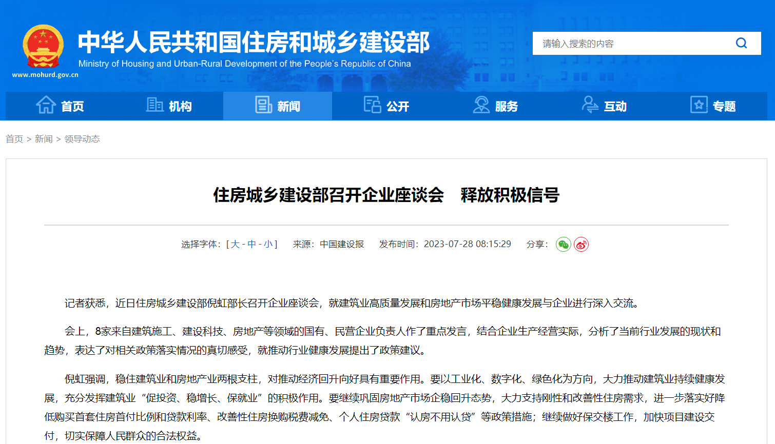 大公房产讯 根据中华人民共和国住房和城乡建设部官网消息,近日,住房城乡建设部部长倪虹召开企业座谈会,就建筑业高质量发展和房地产市场平稳健康发展与企业进行深入交流。