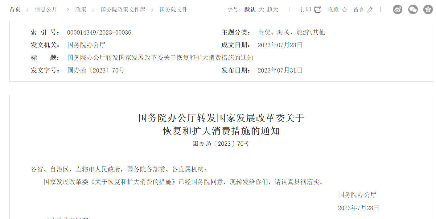 大公房产讯 继中央政治局会议定调“适时调整优化房地产政策”后,国务院办公厅于7月31日转发了国家发展改革委关于恢复和扩大消费措施的通知。