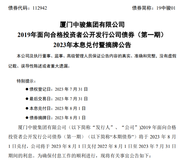 相关公告显示,上述债券为2019年面向合格投资者公开发行公司债券(第一期),债券简称“19中骏01”,存续规模为5.4亿元,债券利率为6.50%,债券期限为4年期,附第2年末发行人调整票面利率选择权和投资者回售选择权。
