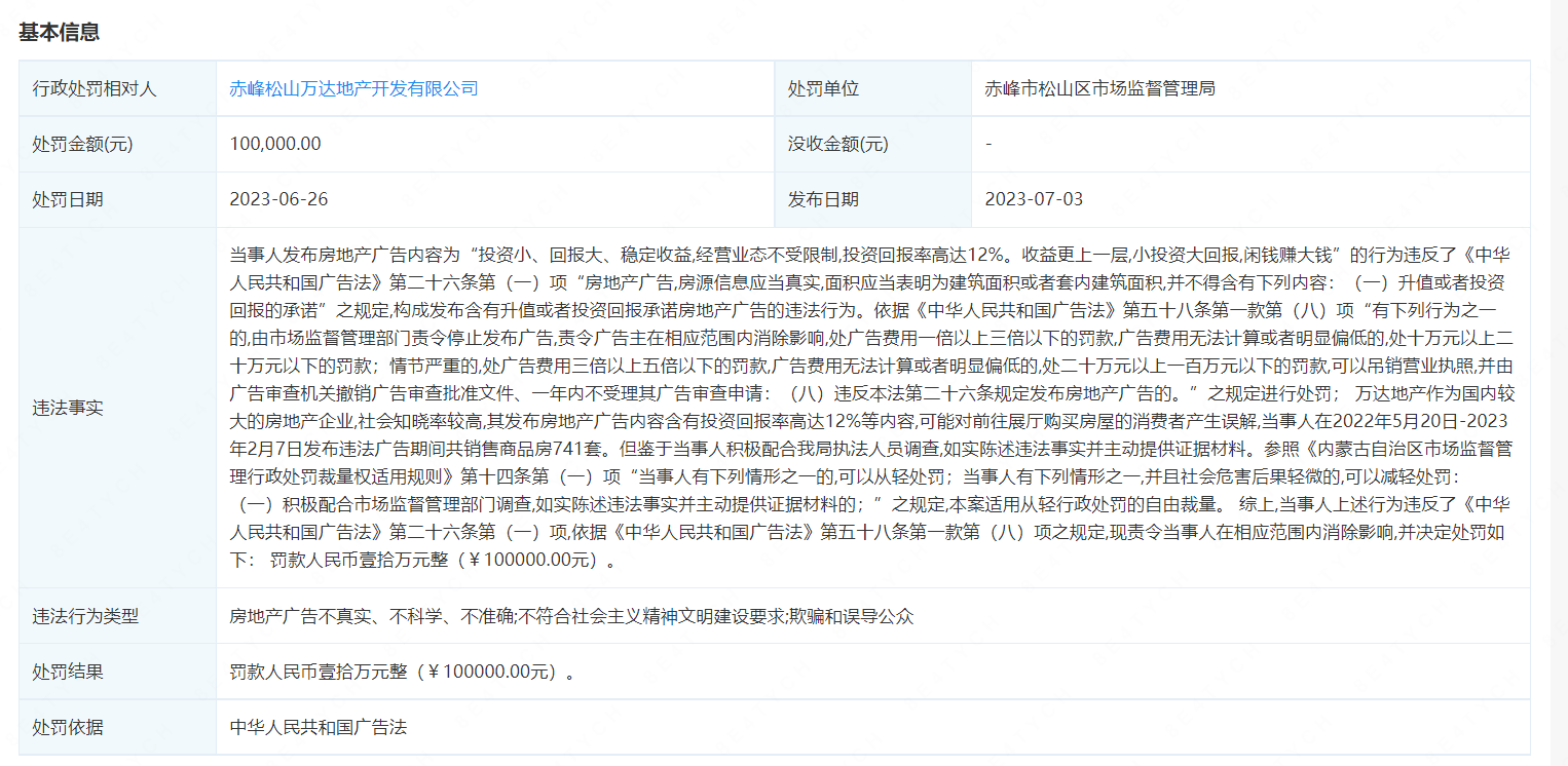 大公房产讯 根据企查查信息,近日,万达地产旗下子公司赤峰松山万达地产开发有限公司(以下简称“松山万达”),因发布违法广告被赤峰市松山区市场监督管理局(以下简称“松山市监局”)行政处罚10万元。