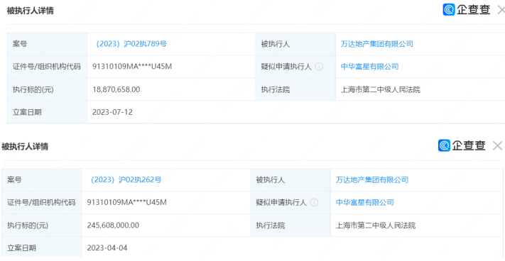 而松山万达的母公司万达地产的日子也并不好过。前不久,万达地产再次被列为失信被执行人。值得一提的是,这是继今年4月20日之后,万达地产第二次成为失信被执行人。上述两次被执行人记录的疑似申请执行人均为中华富星有限公司,执行法院均为上海第二中级人民法院。