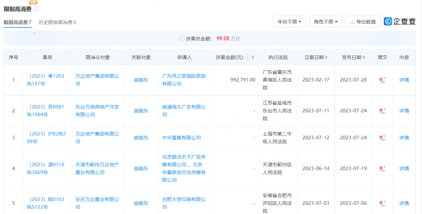 同时,松山万达、万达地产法人曲晓东还被限制高消费,涉案总金额近100万元。其中仅7月份就有5次限高记录。