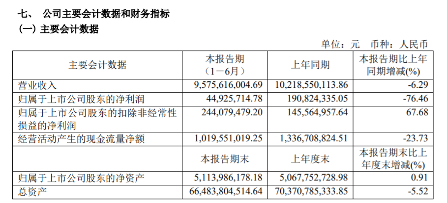报告期内,迪马股份营业收入95.76亿元,同比下降6.29%;归属于上市公司股东的净利润4492.26万元,同比下降76.46%;归属于上市公司股东的扣除非经常性损益的净利润2.44亿元,同比增长67.68%;总资产约664.84亿元,同比下降5.52%。
