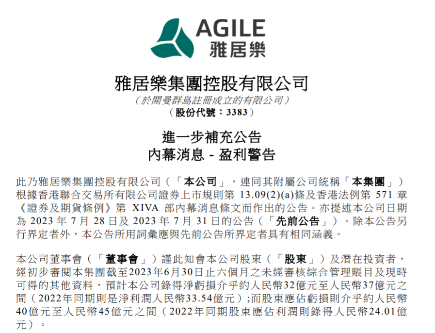 公告显示,截至2023年6月30日止六个月,雅居乐集团预计录得净亏损介乎约32亿元至37亿元之间(2022年同期则是净利润33.54亿元);而股东应占亏损则介乎约40亿元至45亿元之间(2022年同期股东应占利润则录得24.01亿元)。