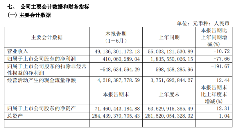 报告期内,金隅集团营收为491.36亿元,同比下降10.72%;净利润4.1亿元,同比下降77.66%;扣非净利润为-5.48亿元,同比下降191.67%。