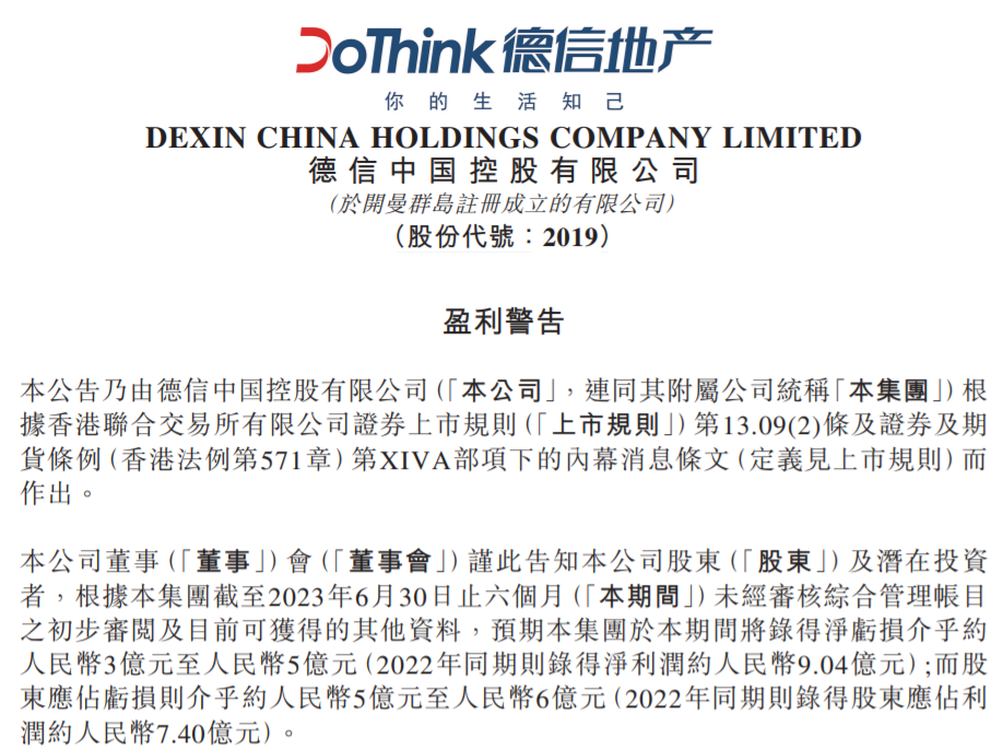 公告显示,德信预期上半年将录得净亏损介乎约3亿元至5亿元(2022年同期则录得净利润约9.04亿元);而股东应占亏损则介乎约5亿元至6亿元(2022年同期则录得股东应占利润约7.40亿元)。